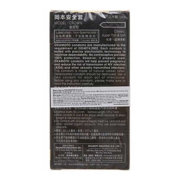Trong đó cũ , bao cao su Okamoto Crown là dòng condom lớn được nhiều nam giới yêu thích giá rẻ . Thông tin chi tiết sản phẩm thống kê như sau: